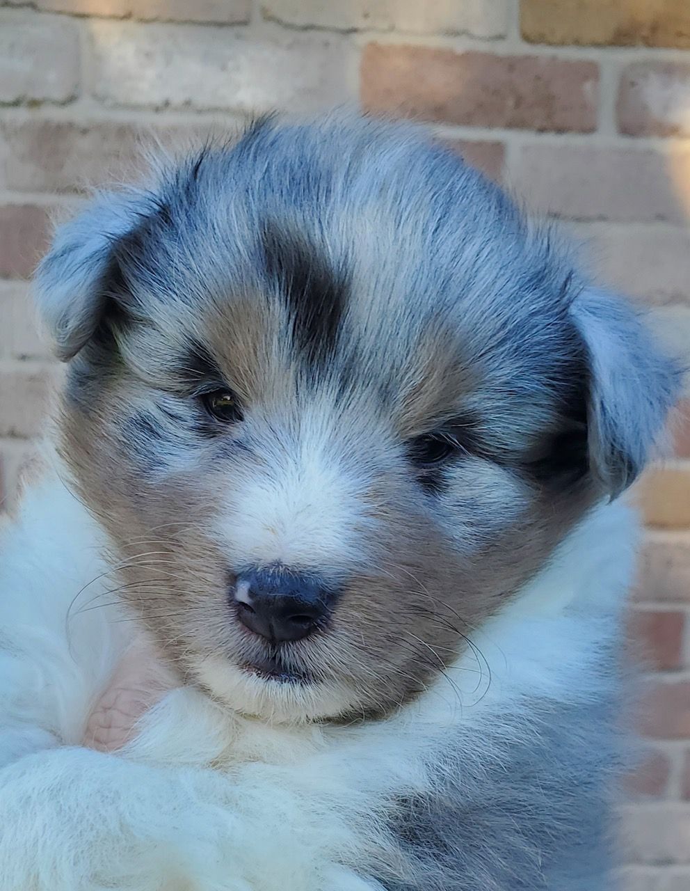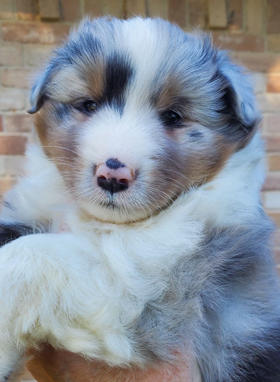 Second blue merle boy pictured below is 6 weeks old in this phone. Call for more details about either puppy.